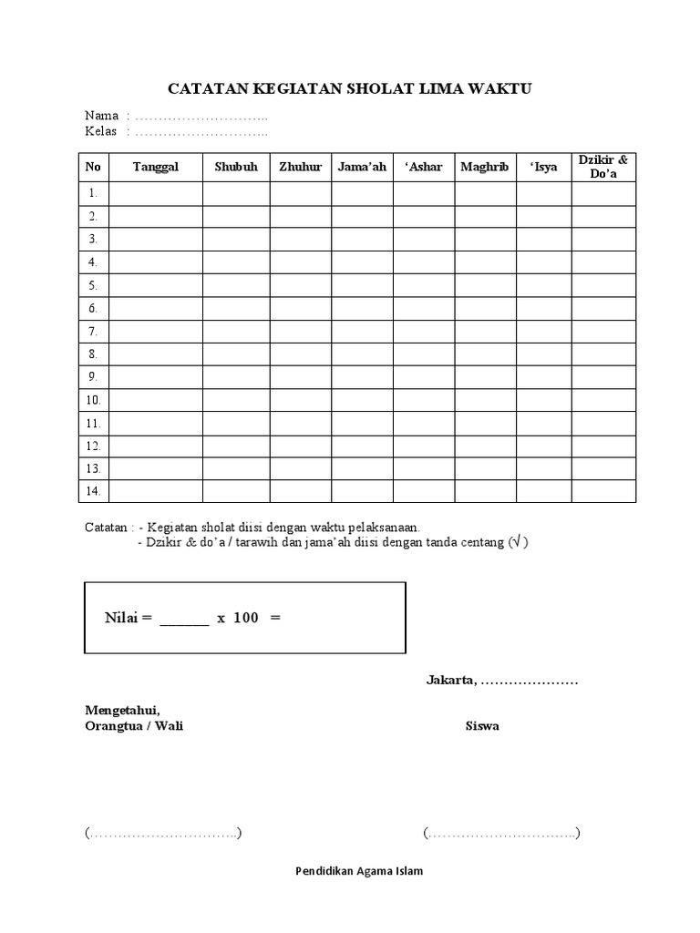 Contoh Buku Agenda Sholat. Tabel Ibadah Keterangan Hasil Shalat Tahajud Shalat Fajar Shalat Subuh Ngaji Shalat Dhuha Qobliyah Dhuhur Shalat Dhuhur Badiyah Dhuhur Shalat Ashar Shalat Maghrib Badiyah Maghrib Shalat Isya Badiyah Isyak Dzikir Puasa Lain-lain. Keberadaan Agenda Kelas ini merupakan tanggungjawab waliguru. Buku Kontrol Shalat Media Pendidikan Habituasi. Telusuri template agenda harian untuk setiap gaya dan tema mulai dari cerah dan penuh warna hingga minimalis dan klasik.